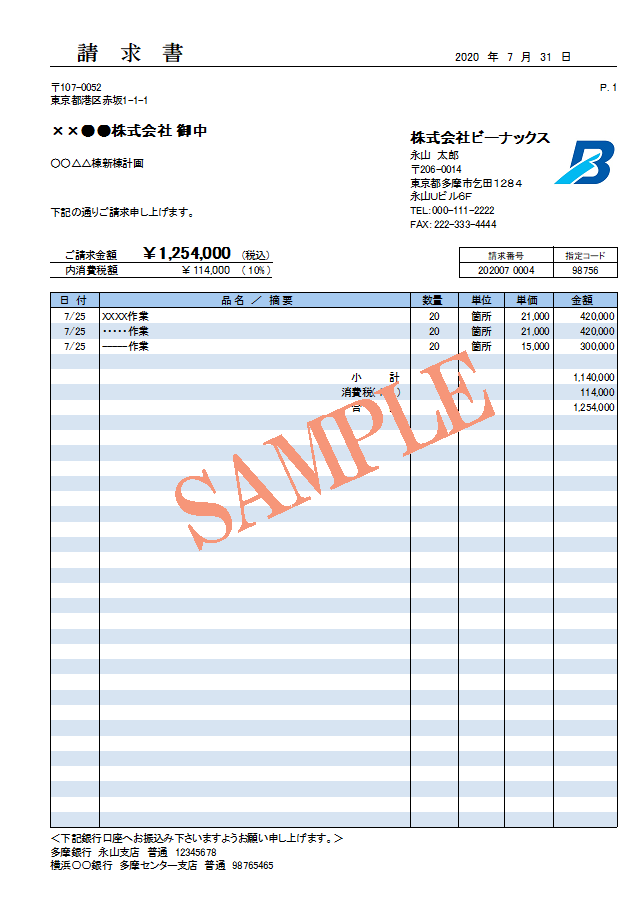 台帳に登録した情報をもとに、工事現場宛ての請求書作成が可能です。